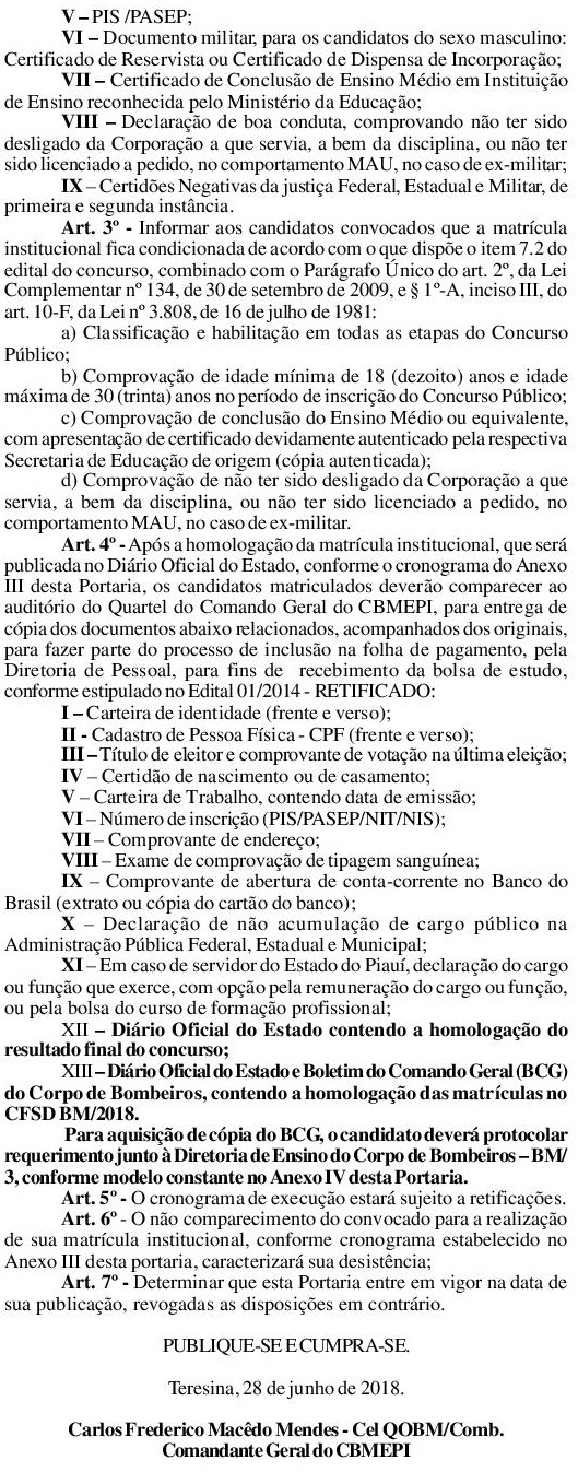 O Diário oficial do Piauí divulgou portaria convocando candidatos aprovados no Concurso Público do Corpo de Bombeiros Militar do Estado do Piauí, para matrícula institucional no Curso de Formação de Soldados Bombeiros Militares.
