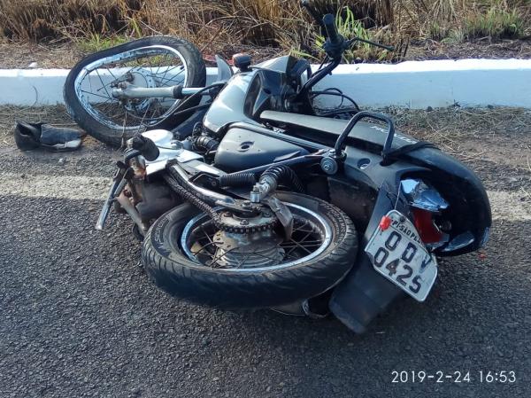 O acidente envolveu a motocicleta modelo Honda Pop 100, placa ODV-0425, e uma Carreta placa NTV-8572.