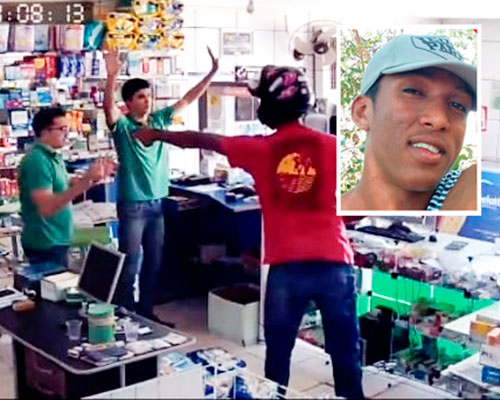 Na imagem da câmera, o assaltante entra na área interna do prédio usando uma mulher como escudo e logo anuncia o assalto, manda que o funcionário da farmácia e o proprietário peguem todo o dinheiro e lhe entreguem, depois manda que eles deitem no chão e pede que eles entreguem também os aparelhos celulares.