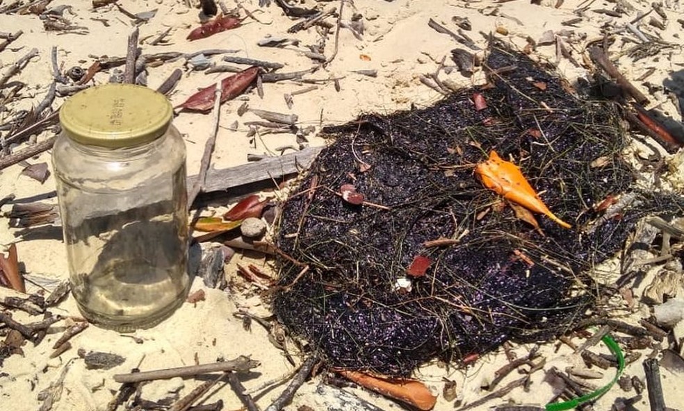Óleo cru foi encontrado em capim-agulha, principal alimento do peixe-boi, na Praia da Lama (PI) — Foto: Pesca Solidária da Comissão Ilha Ativa