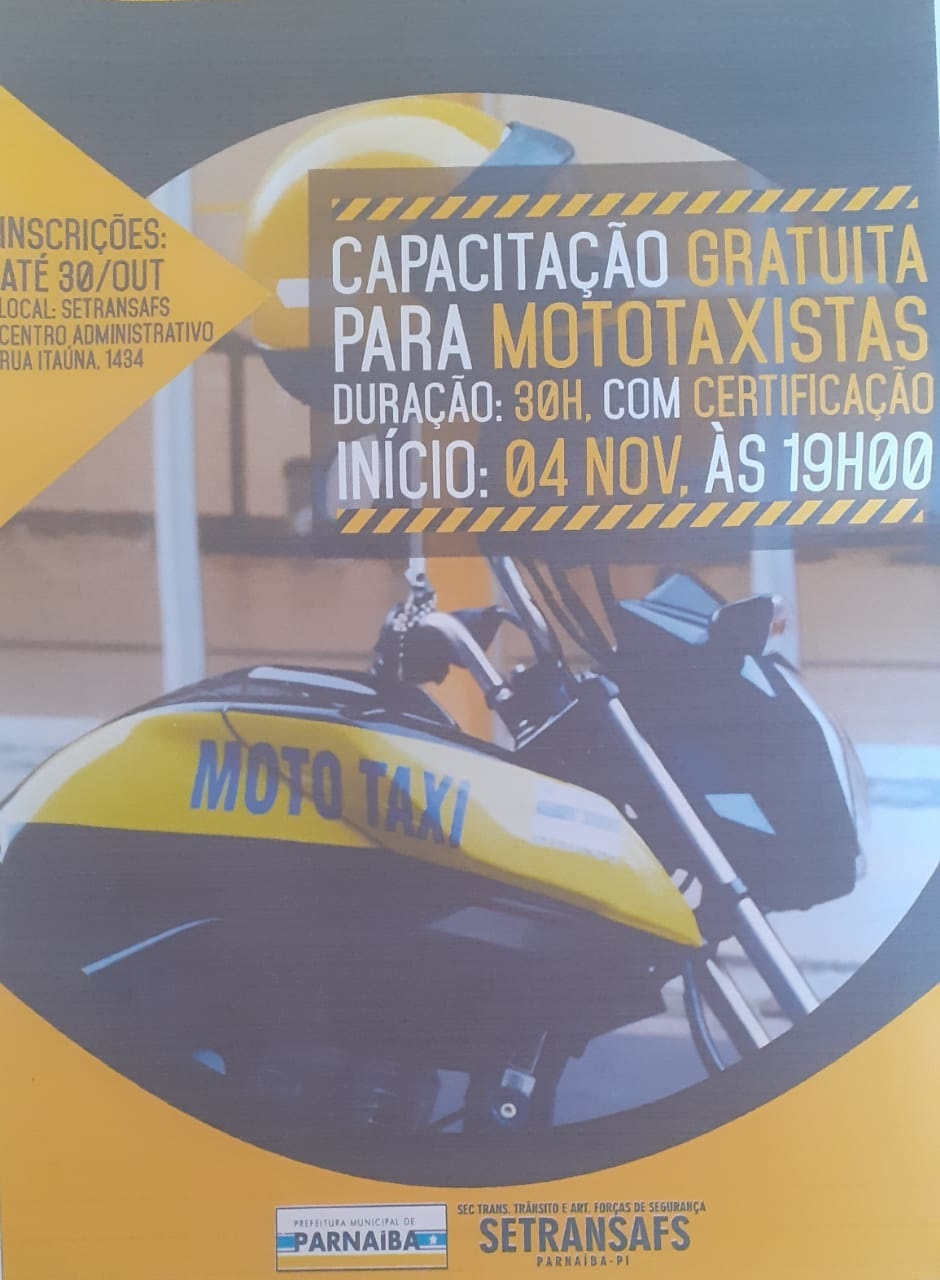 Prosseguem até o dia 30 de outubro as inscrições para o Curso de Capacitação para Mototaxistas, que será promovido, gratuitamente, pela Secretaria Municipal de Transportes e Trânsito, em atendimento ao Decreto Municipal nº 28/2017.