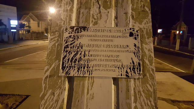A placa Inaugurada pelo prefeito Francisco de Assis de Moraes Souza – Mão Santa - na manhã desta sexta-feira, 14 de agosto, dia do aniversário da cidade de Parnaíba, em homenagem ao presidente da república, Jair Messias Bolsonaro no Centro Cívico de Parnaíba, em menos de uma hora após sua inauguração já foi pichada e vandalizada.