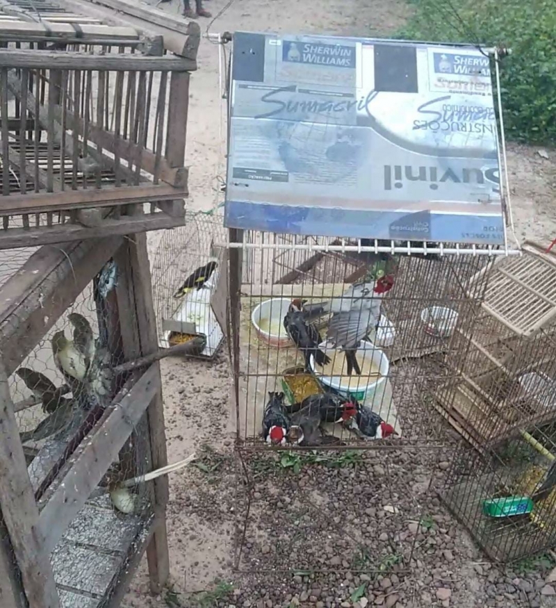 Durante a ação policial, foram apreendidas diversas gaiolas lotadas de aves nativas da região, como cabeça de bode, xexéu, bigode, curica, sabiá, entre outros.