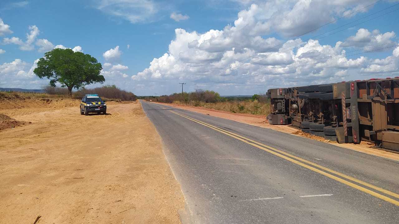 Um veículo de carga com sacas da ração animal saiu da pista e tombou na tarde desse domingo (24/10), na BR-135, em Bom Jesus, Sul do Piauí.