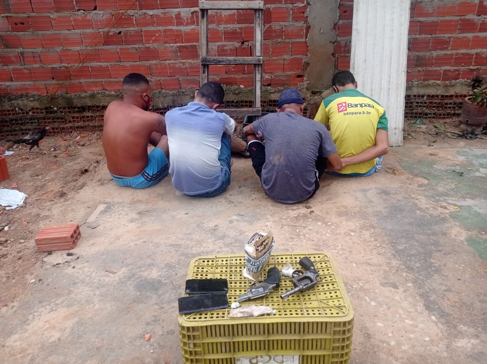A Polícia Militar recebeu um comunicado de que algumas pessoas estariam comercializando entorpecentes e ostentando armas de fogo. A equipe se deslocou ao bairro e constatou a situação.