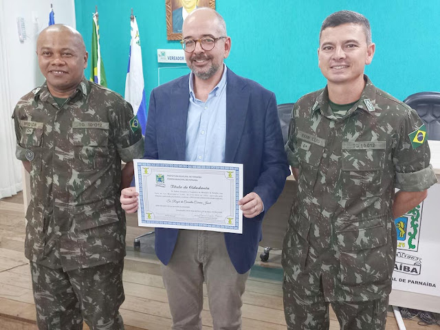 O novo cidadão parnaibano, Roger Jacob, ao lado de oficiais do Exército brasileiro.