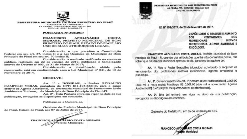 Nomeação do ex-vereador, à esquerda, e publicação da lei do reajuste, à direita — Foto: Reprodução