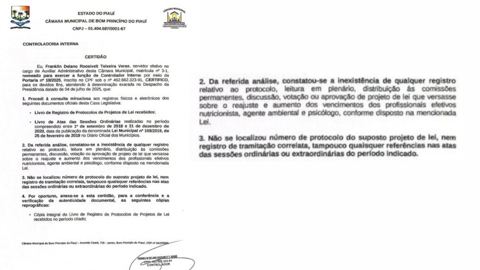 O Ministério Público solicitou que a Câmara de Bom Princípio do Piauí informe se pretende abrir processo de cassação contra o prefeito. O g1 também procurou o Tribunal de Contas e aguarda resposta.