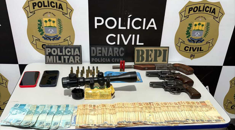 Dinheiro, armas e celulares apreendidos. | Foto: Ascom SSP.Cerca de R$ 4 mil em espécie, três armas de fogo e uma grande quantidade de munições foram apreendidos em uma operação do Departamento Estadual de Repressão ao Narcotráfico (DENARC), deflagrada nesta sexta-feira (12), em Gilbués, no Sul do Piauí.