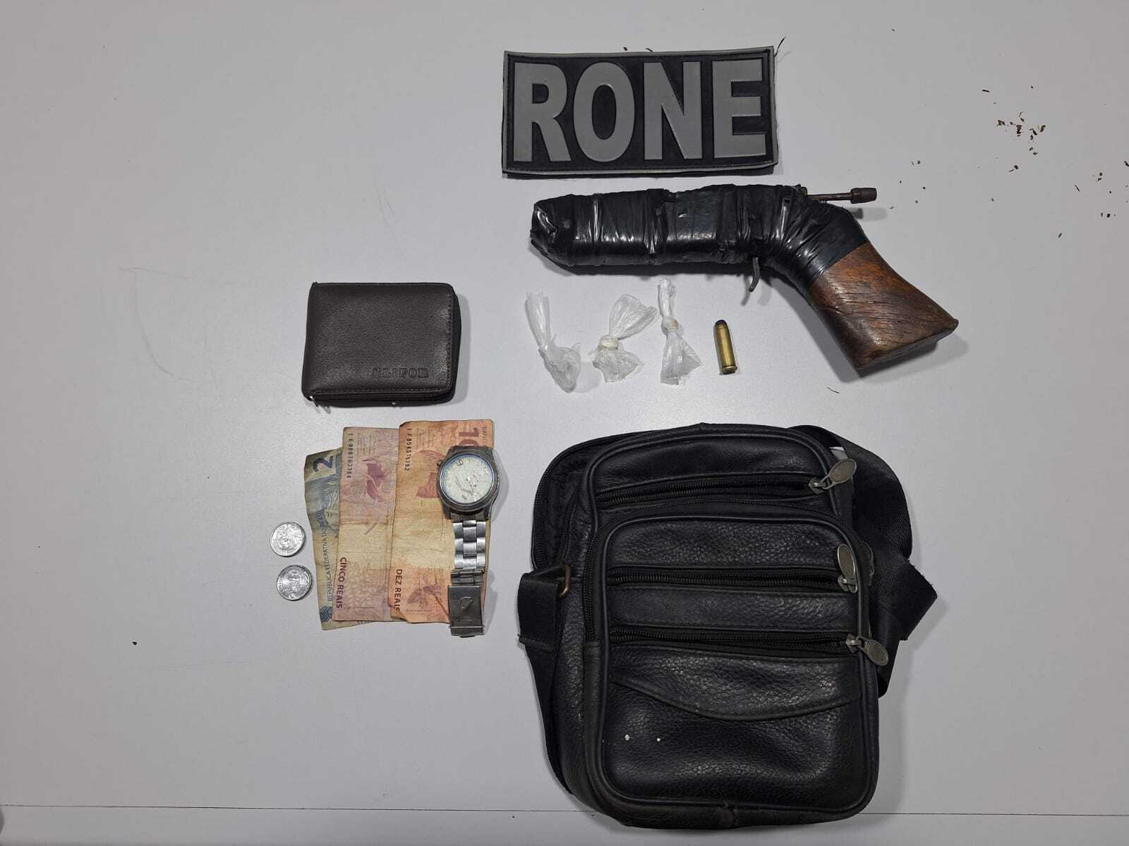 Material apreendido com o suspeito- ReproduçãoAo chegarem ao local, Júlio César Silva foi abordado e, durante a busca pessoal, foi encontrada uma arma de fogo com ele, além de munições e três invólucros contendo crack.